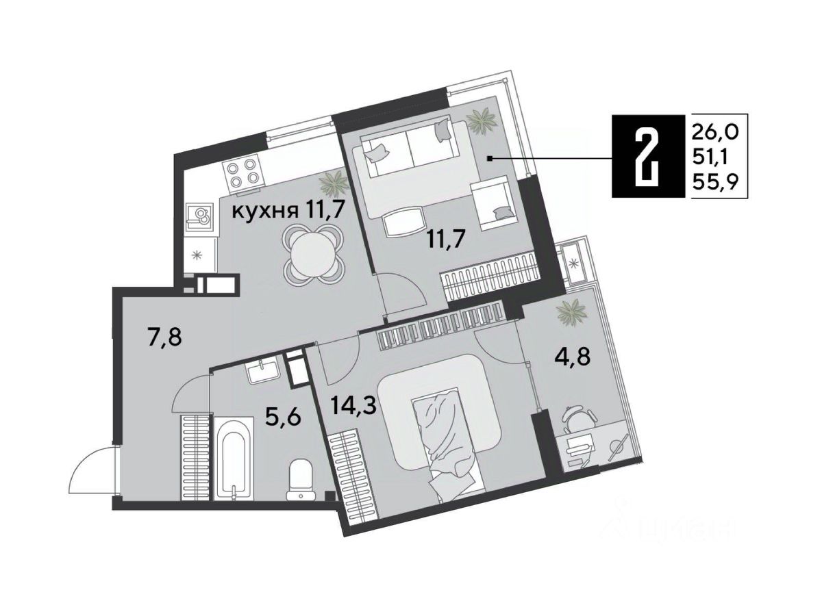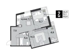 Срок сдачи: 2 кв. 2026, общей площадью 55.9 кв.м., на 15 этаже.
