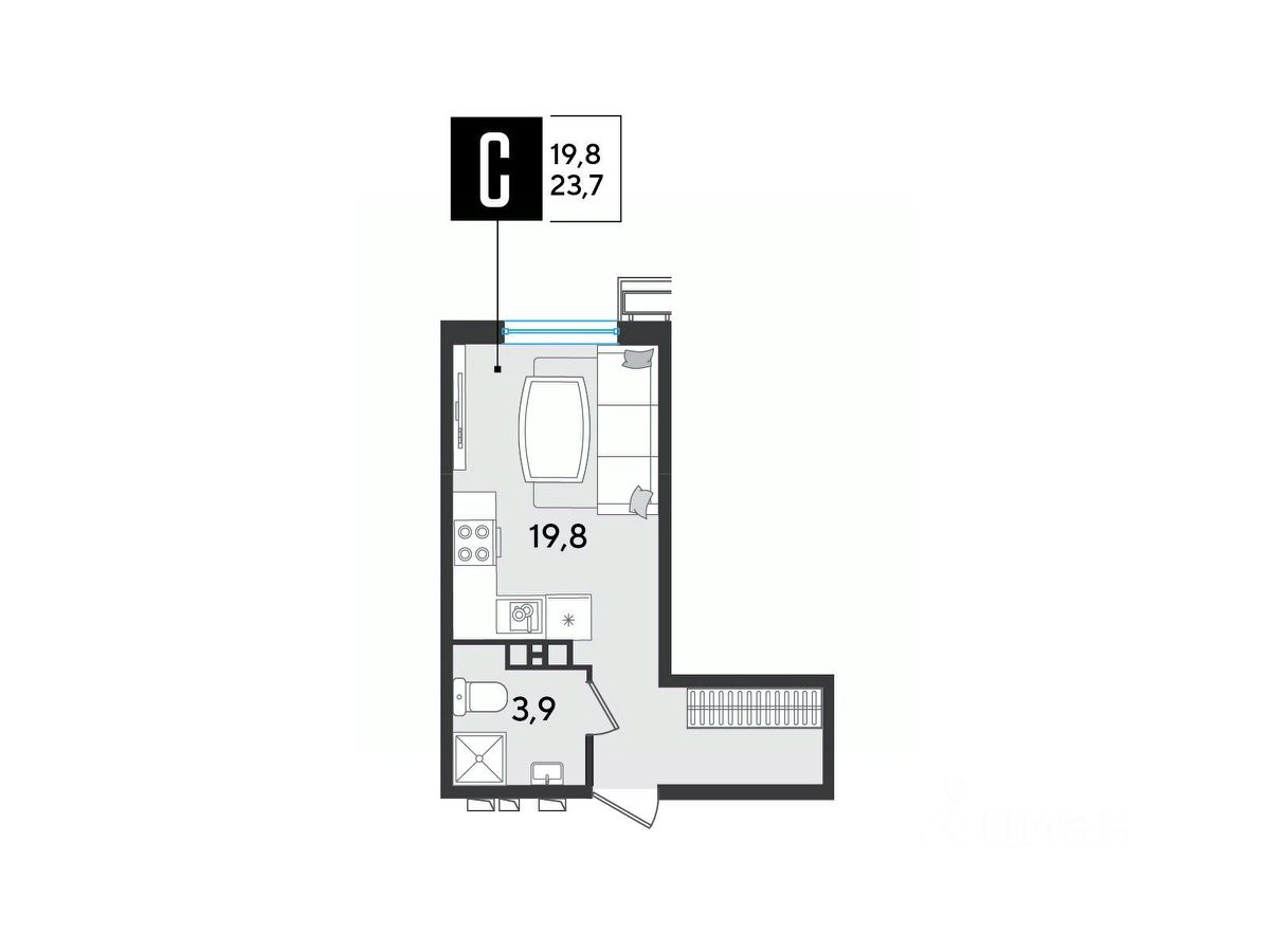 Срок сдачи: 2 кв. 2026, общей площадью 23.7 кв.м., на 9 этаже.