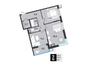 Срок сдачи: 2 кв. 2026, общей площадью 64.1 кв.м., на 11 этаже.