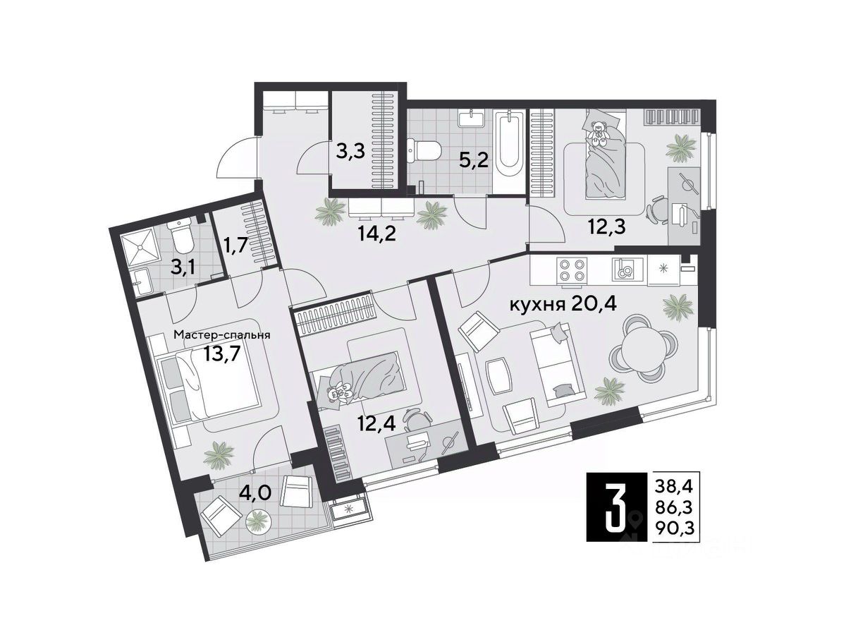Срок сдачи: 2 кв. 2026, общей площадью 90.3 кв.м., на 2 этаже.
