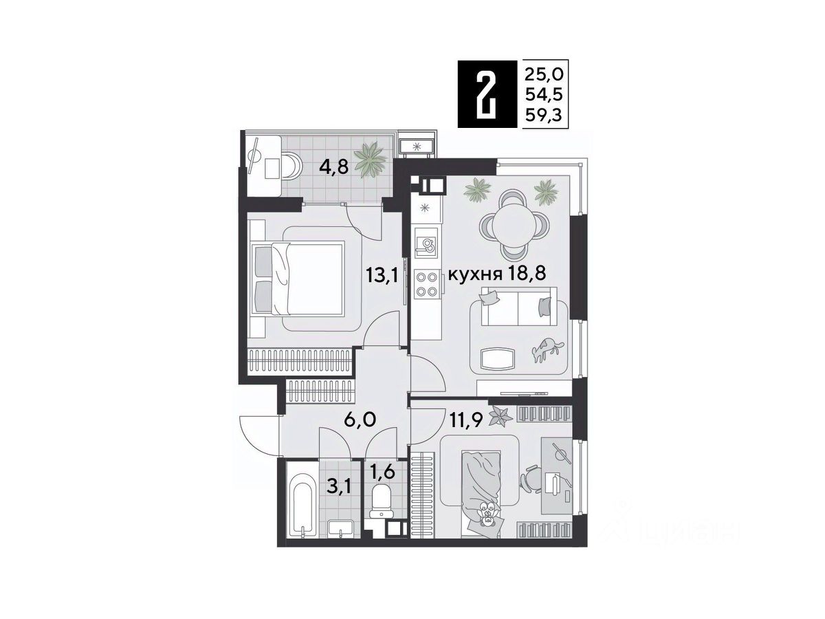 Срок сдачи: 2 кв. 2026, общей площадью 59.3 кв.м., на 3 этаже.