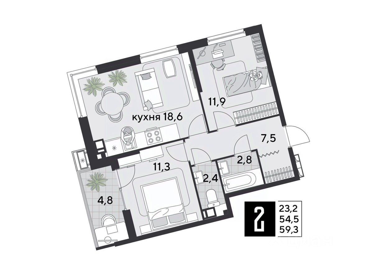 Срок сдачи: 2 кв. 2026, общей площадью 59.3 кв.м., на 4 этаже.