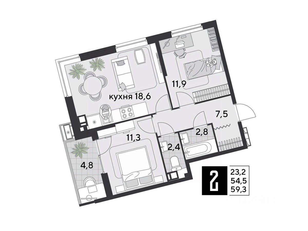 Срок сдачи: 2 кв. 2026, общей площадью 59.3 кв.м., на 5 этаже.