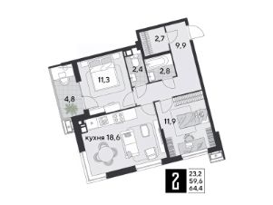 Срок сдачи: 2 кв. 2026, общей площадью 64.4 кв.м., на 7 этаже.