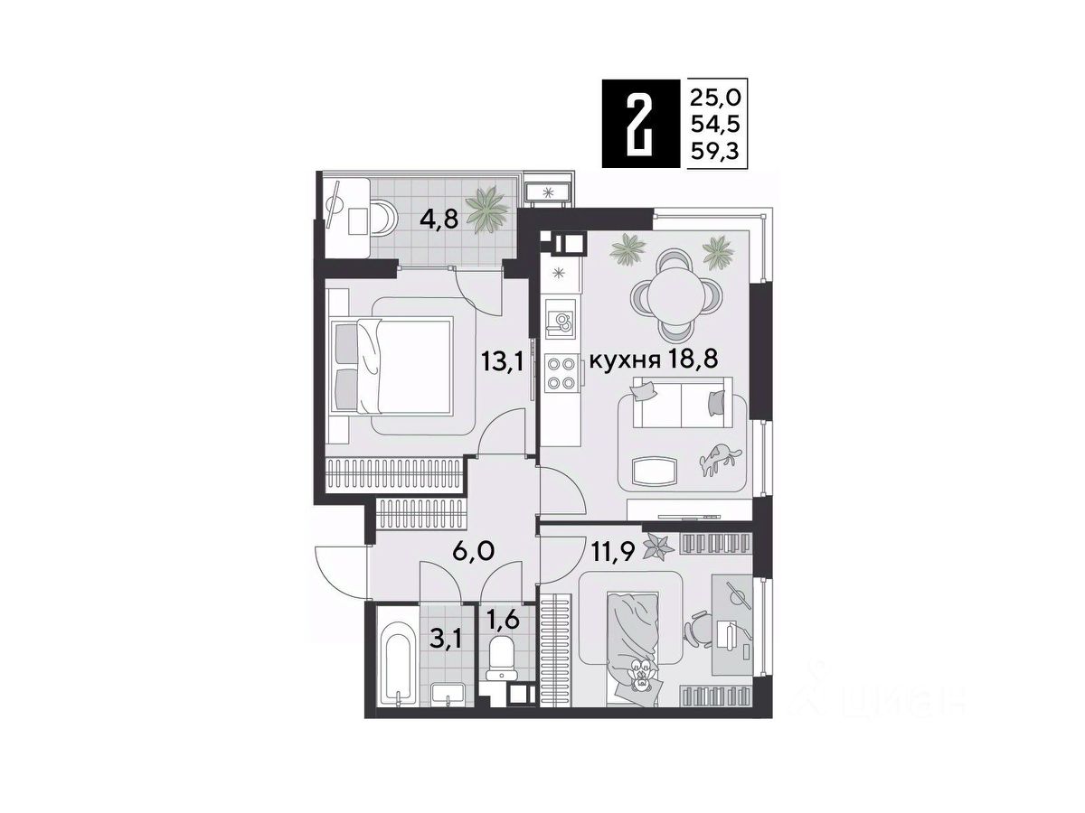 Срок сдачи: 2 кв. 2026, общей площадью 59.3 кв.м., на 9 этаже.