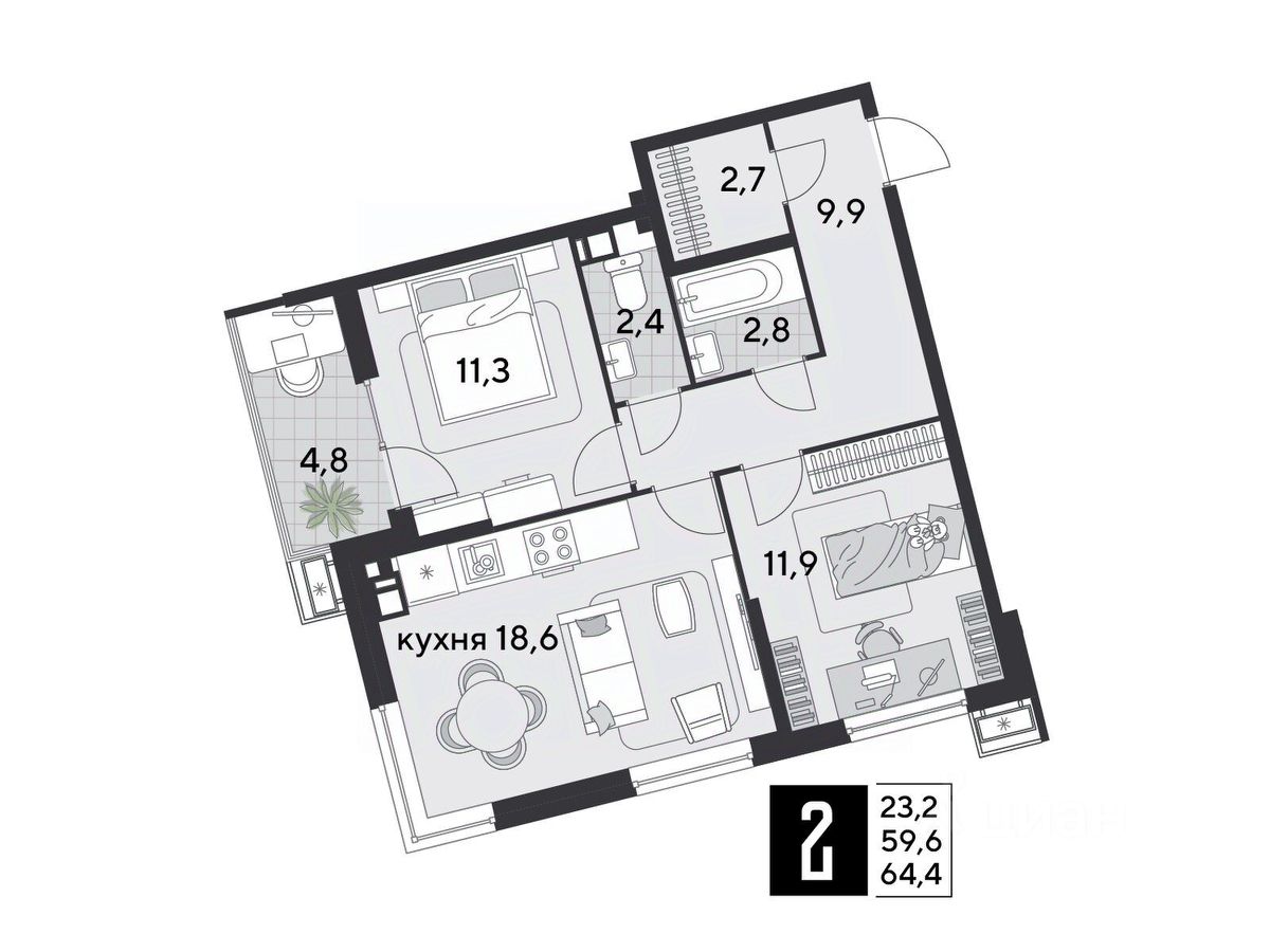Срок сдачи: 2 кв. 2026, общей площадью 64.4 кв.м., на 9 этаже.