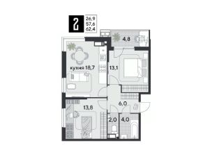 Срок сдачи: 2 кв. 2026, общей площадью 62.4 кв.м., на 10 этаже.