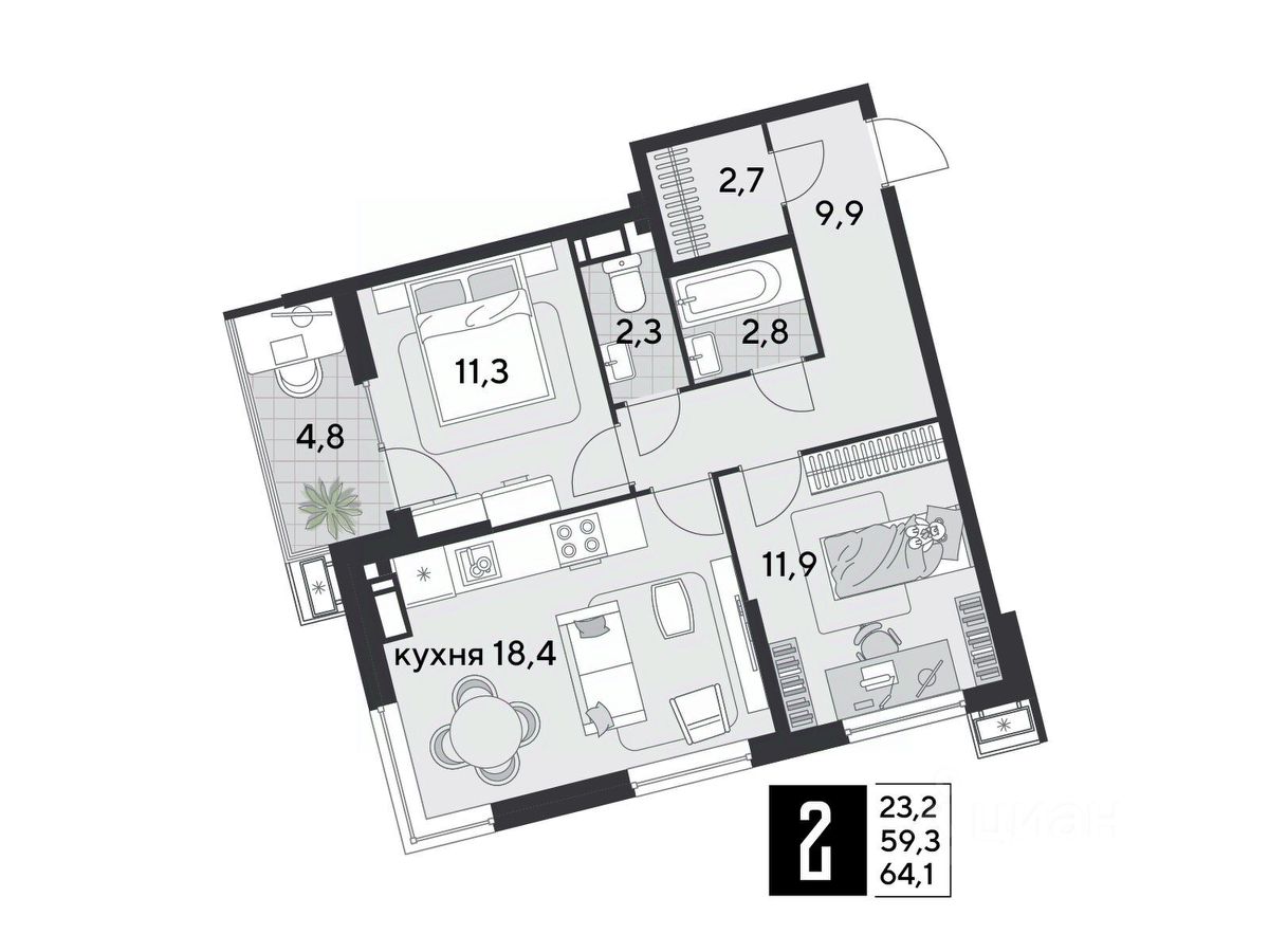 Срок сдачи: 2 кв. 2026, общей площадью 64.1 кв.м., на 10 этаже.