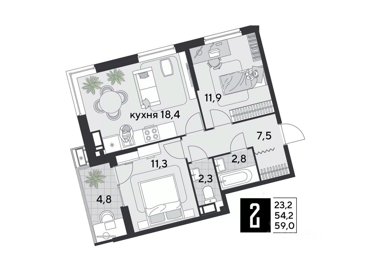 Срок сдачи: 2 кв. 2026, общей площадью 59 кв.м., на 10 этаже.