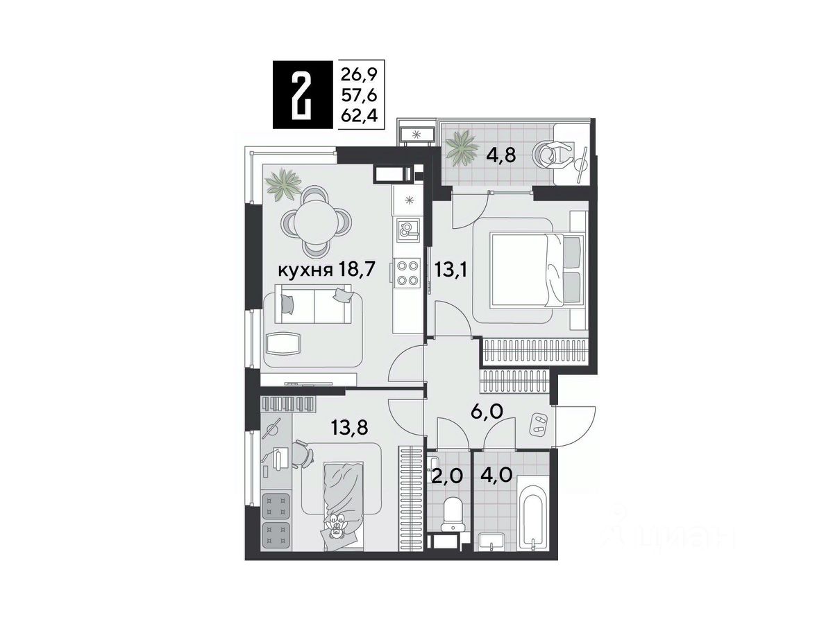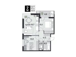 Срок сдачи: 2 кв. 2026, общей площадью 62.4 кв.м., на 14 этаже.