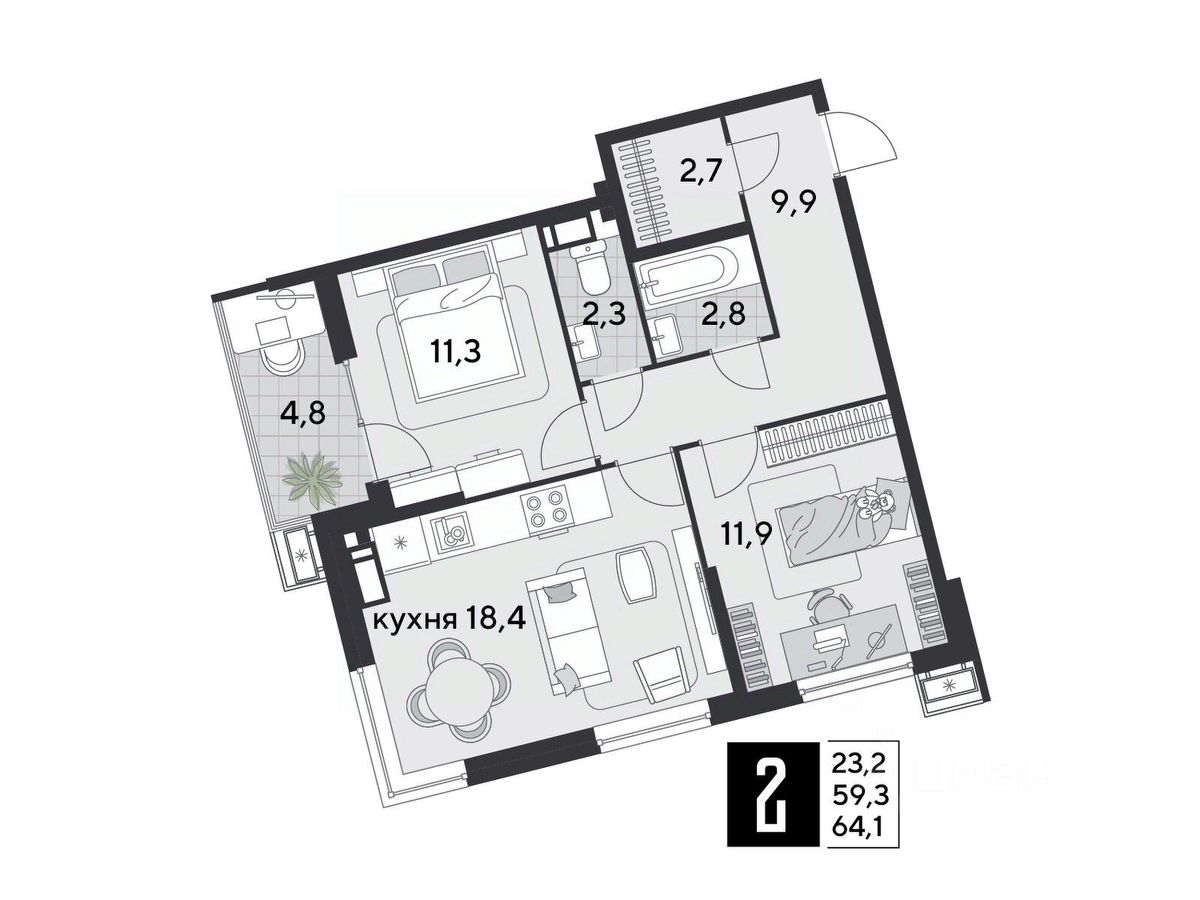 Срок сдачи: 2 кв. 2026, общей площадью 64.1 кв.м., на 14 этаже.