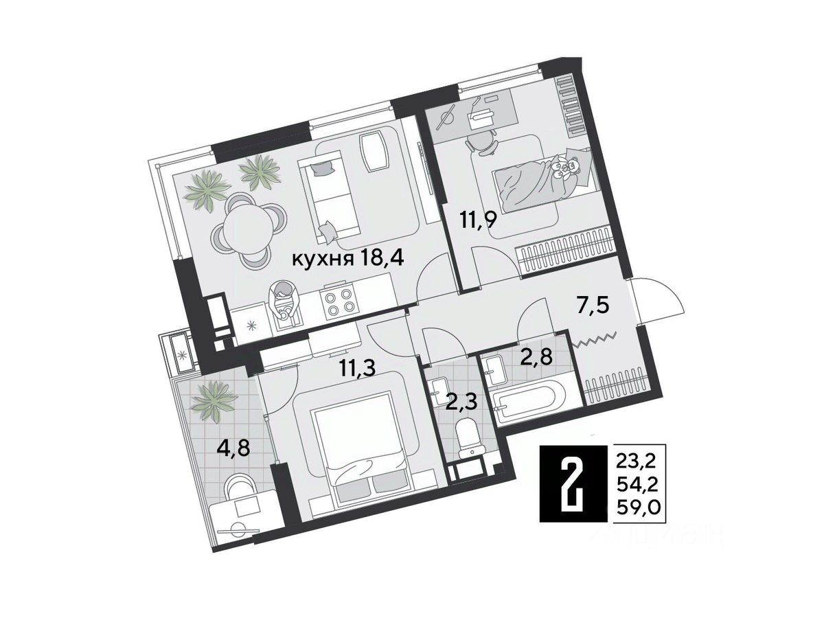 Срок сдачи: 2 кв. 2026, общей площадью 59 кв.м., на 14 этаже.