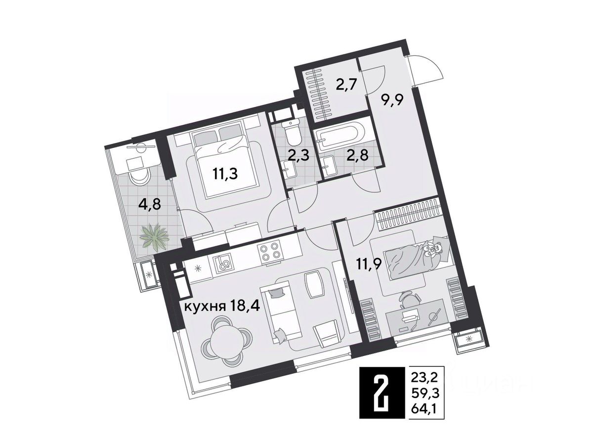 Срок сдачи: 2 кв. 2026, общей площадью 64.1 кв.м., на 16 этаже.