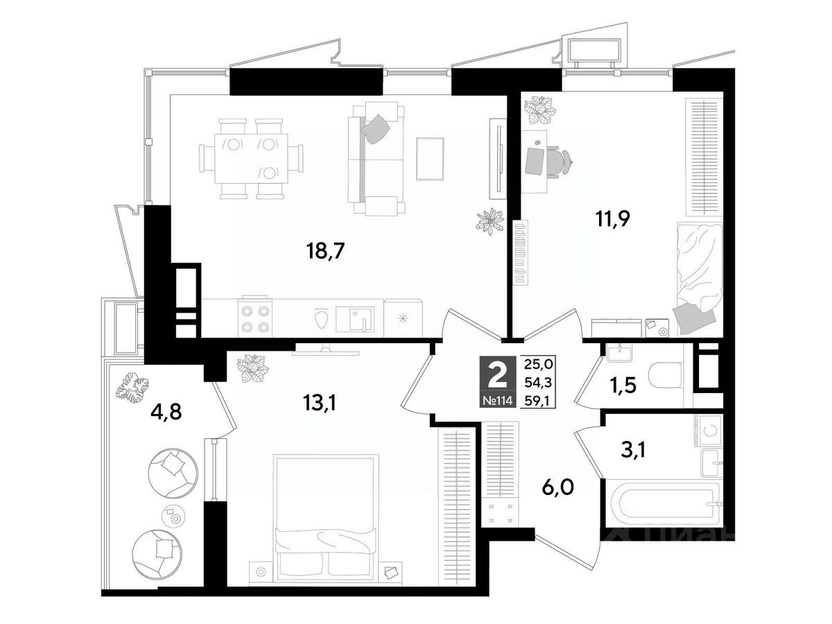 Срок сдачи: 2 кв. 2026, общей площадью 59.1 кв.м., на 18 этаже.