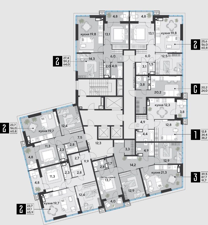 •Квартиры с мастер-спальнями и отдельными гардеробными
