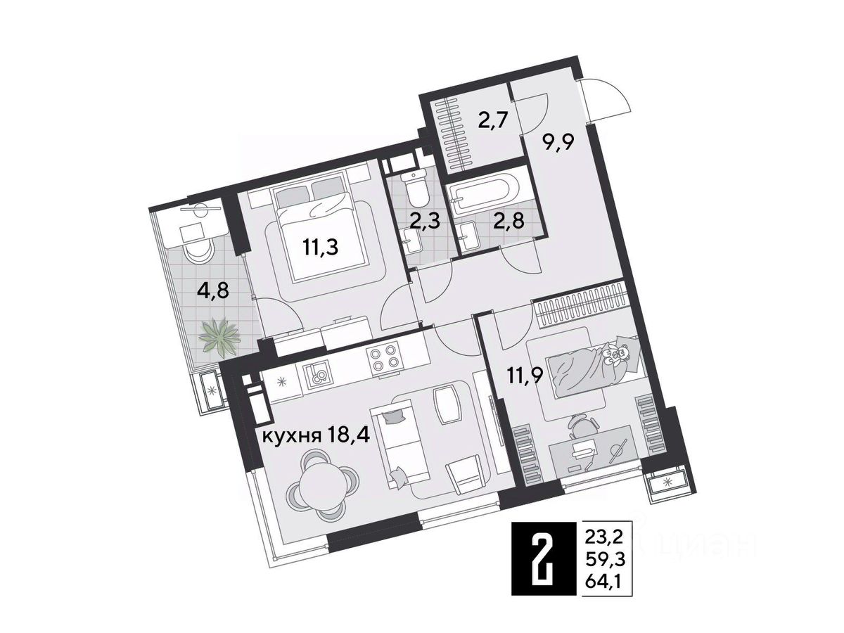 Срок сдачи: 2 кв. 2026, общей площадью 64.1 кв.м., на 18 этаже.