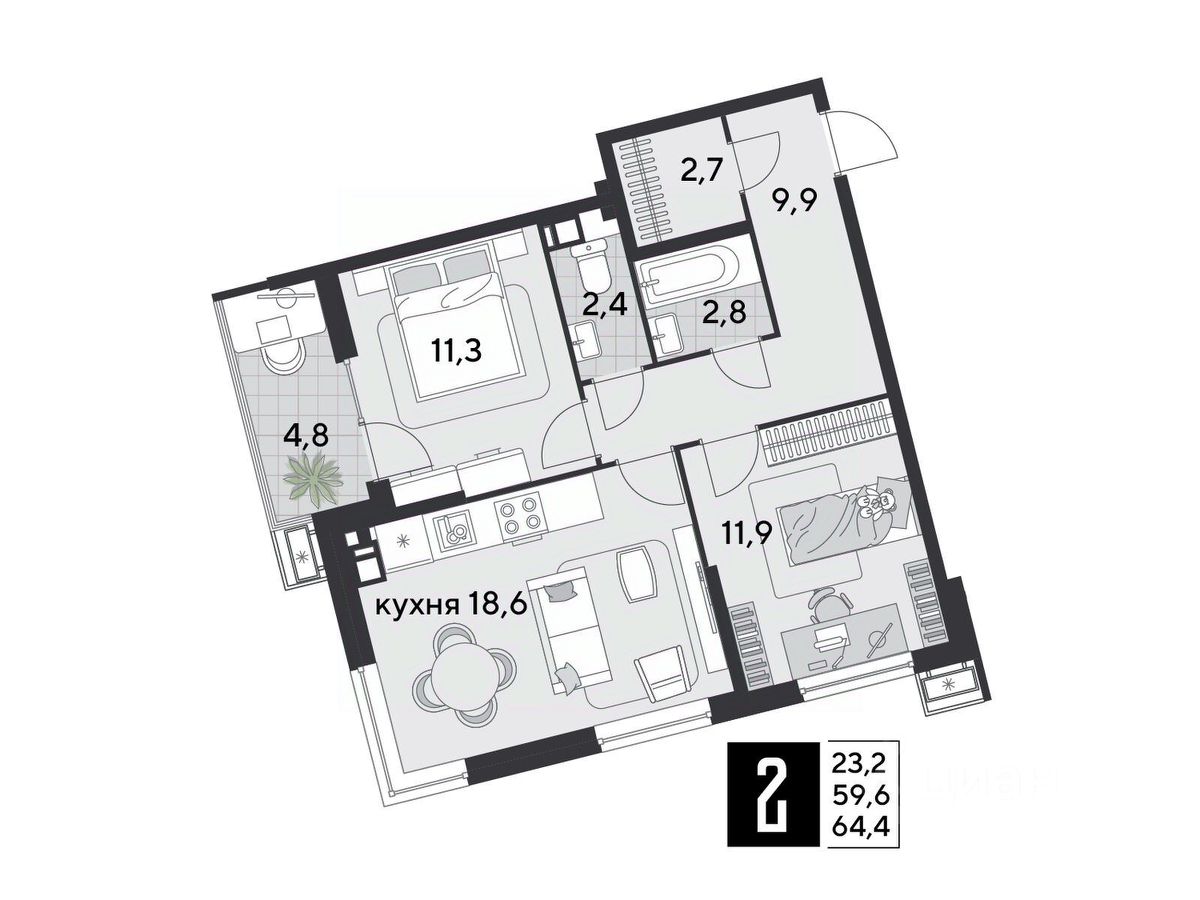Срок сдачи: 2 кв. 2026, общей площадью 64.4 кв.м., на 4 этаже.