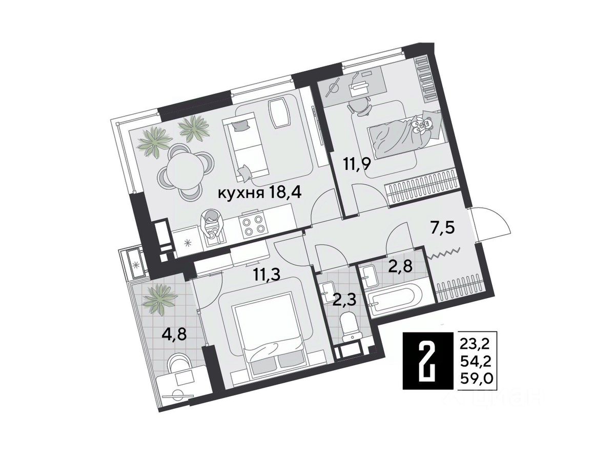 Срок сдачи: 2 кв. 2026, общей площадью 59 кв.м., на 18 этаже.