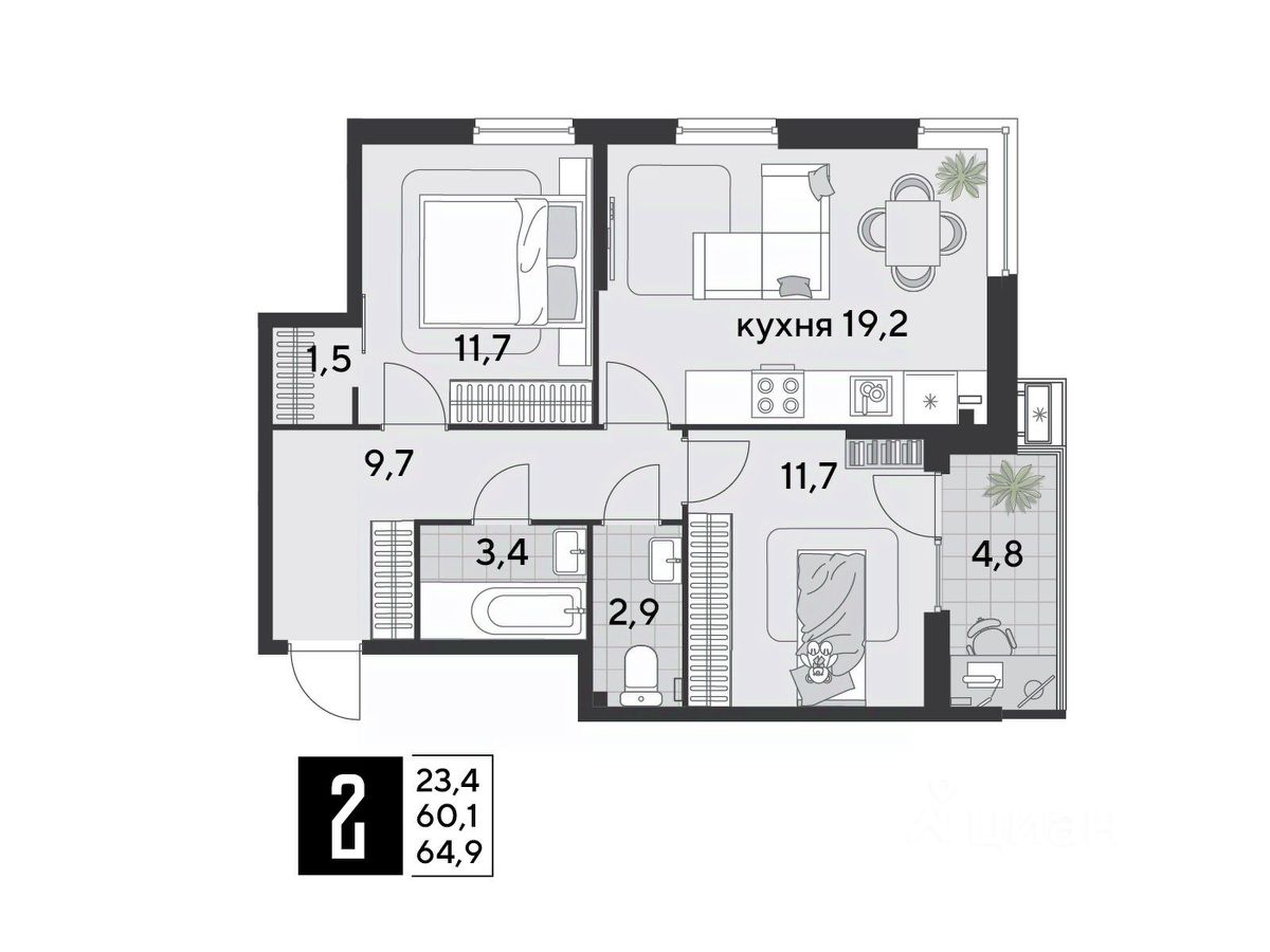 Срок сдачи: 1 кв. 2026, общей площадью 64.9 кв.м., на 2 этаже.