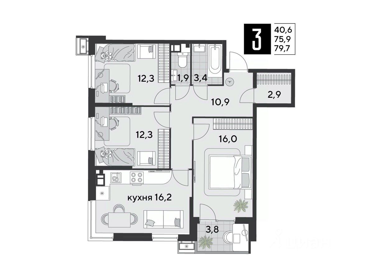 Срок сдачи: 1 кв. 2026, общей площадью 79.7 кв.м., на 3 этаже.