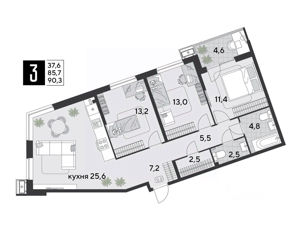 Срок сдачи: 1 кв. 2026, общей площадью 90.3 кв.м., на 2 этаже.