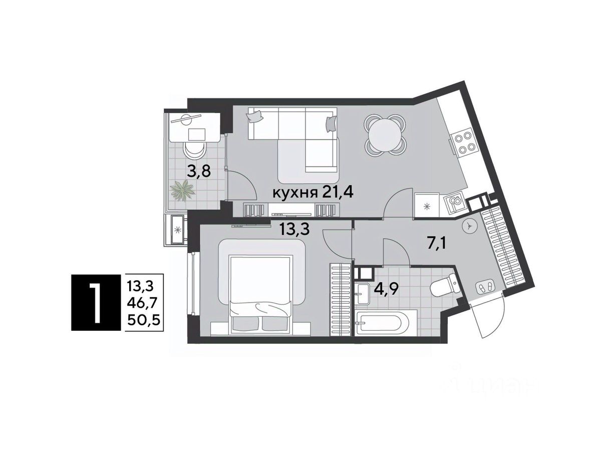 Срок сдачи: 1 кв. 2026, общей площадью 50.5 кв.м., на 3 этаже.