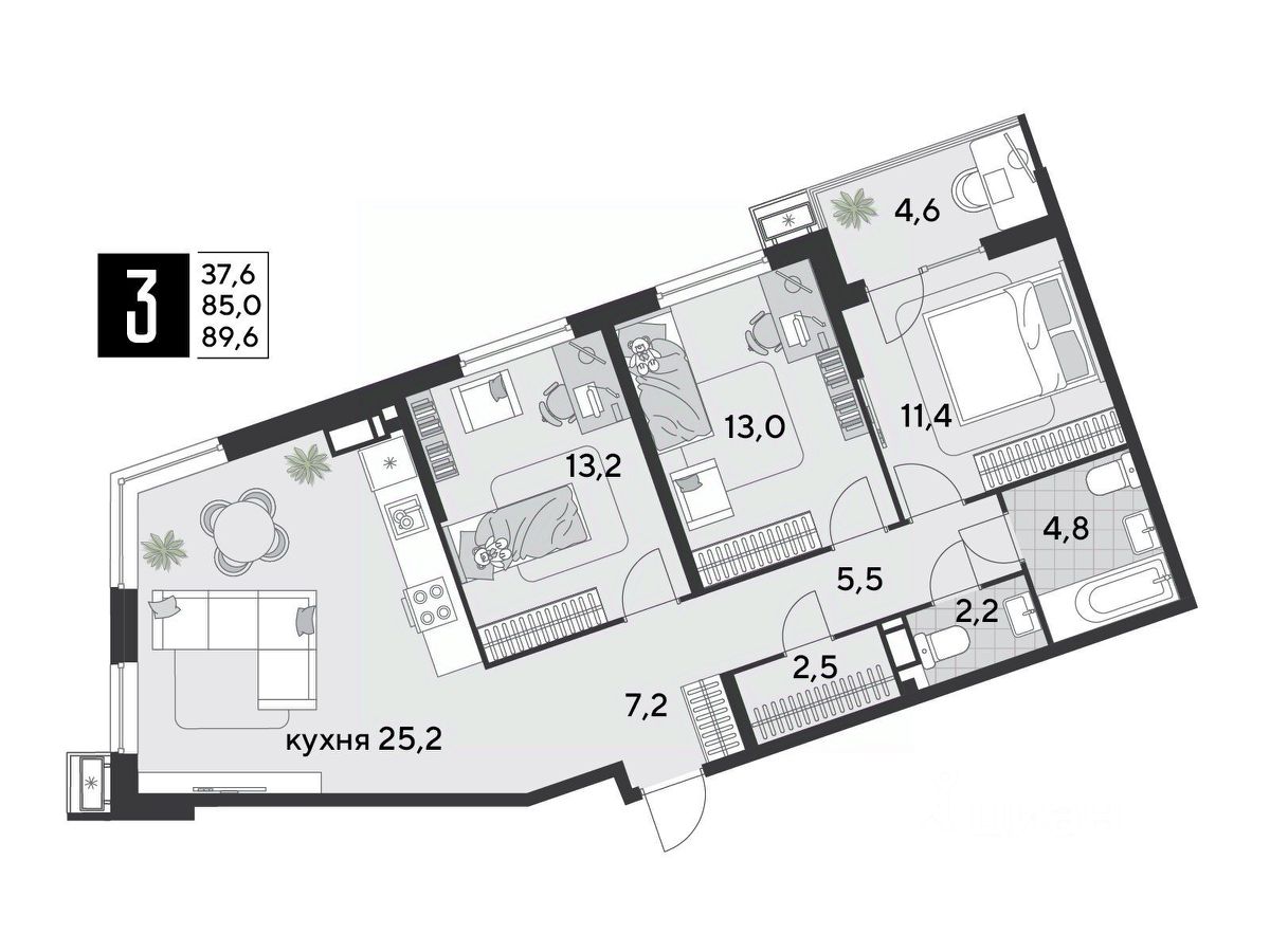 Срок сдачи: 1 кв. 2026, общей площадью 89.6 кв.м., на 12 этаже.