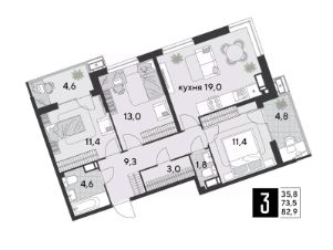 Срок сдачи: 1 кв. 2026, общей площадью 82.9 кв.м., на 18 этаже.