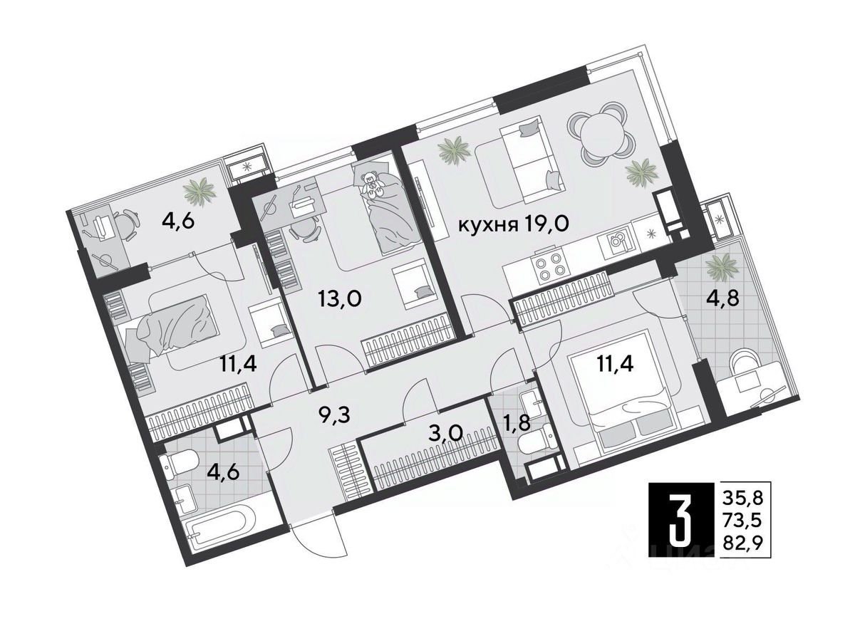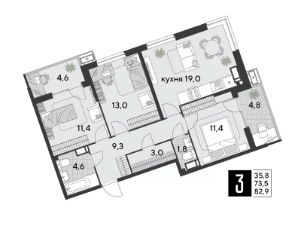 Срок сдачи: 1 кв. 2026, общей площадью 82.9 кв.м., на 12 этаже.