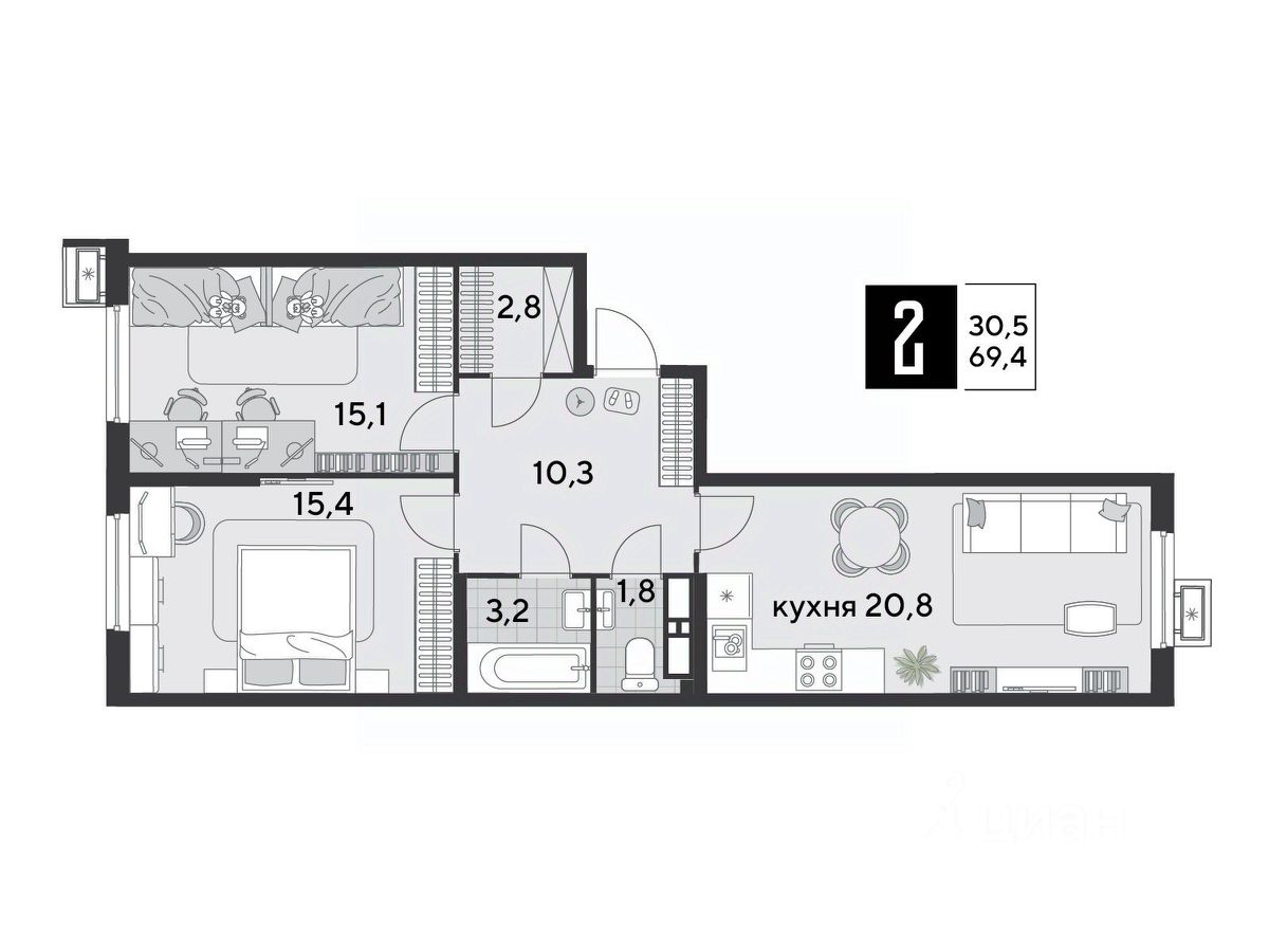 Срок сдачи: 1 кв. 2026, общей площадью 69.4 кв.м., на 10 этаже.