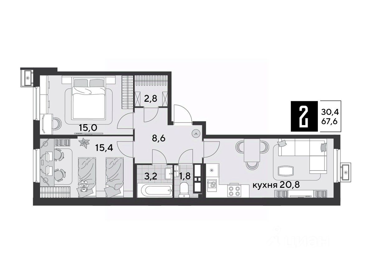 Срок сдачи: 2 кв. 2026, общей площадью 67.6 кв.м., на 16 этаже.