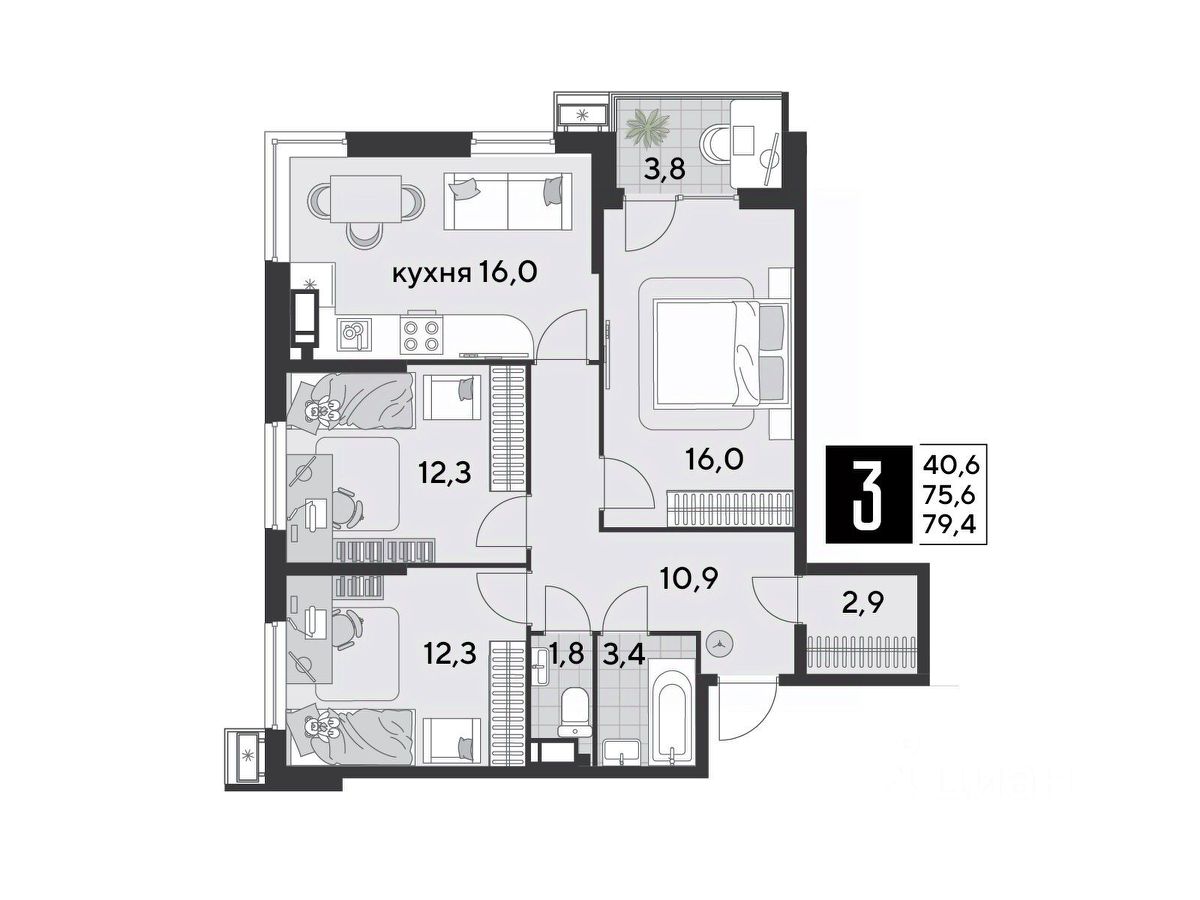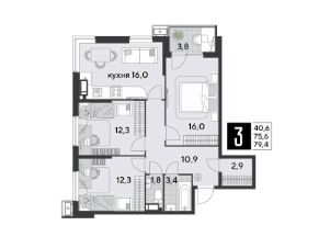 Срок сдачи: 2 кв. 2026, общей площадью 79.4 кв.м., на 18 этаже.
