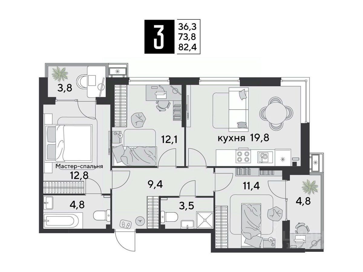 Срок сдачи: 2 кв. 2026, общей площадью 82.4 кв.м., на 2 этаже.