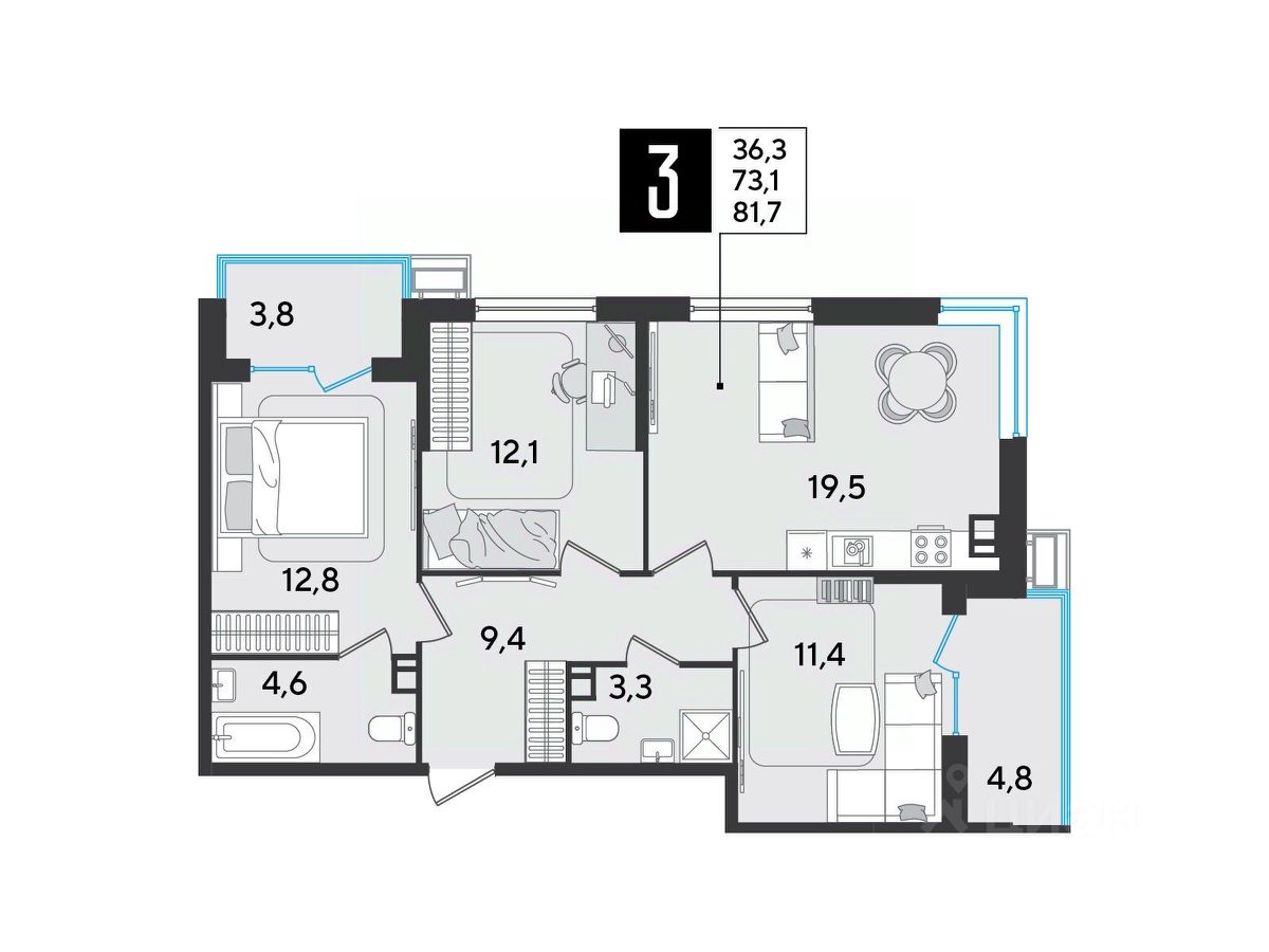 Срок сдачи: 2 кв. 2026, общей площадью 81.7 кв.м., на 3 этаже.