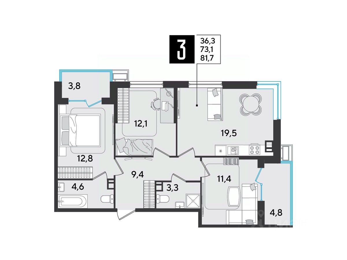 Срок сдачи: 2 кв. 2026, общей площадью 81.7 кв.м., на 4 этаже.