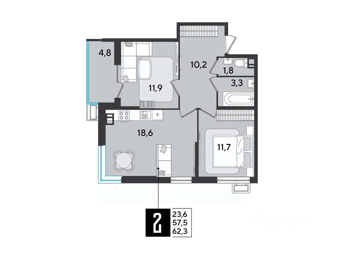 Срок сдачи: 2 кв. 2026, общей площадью 62.3 кв.м., на 6 этаже.