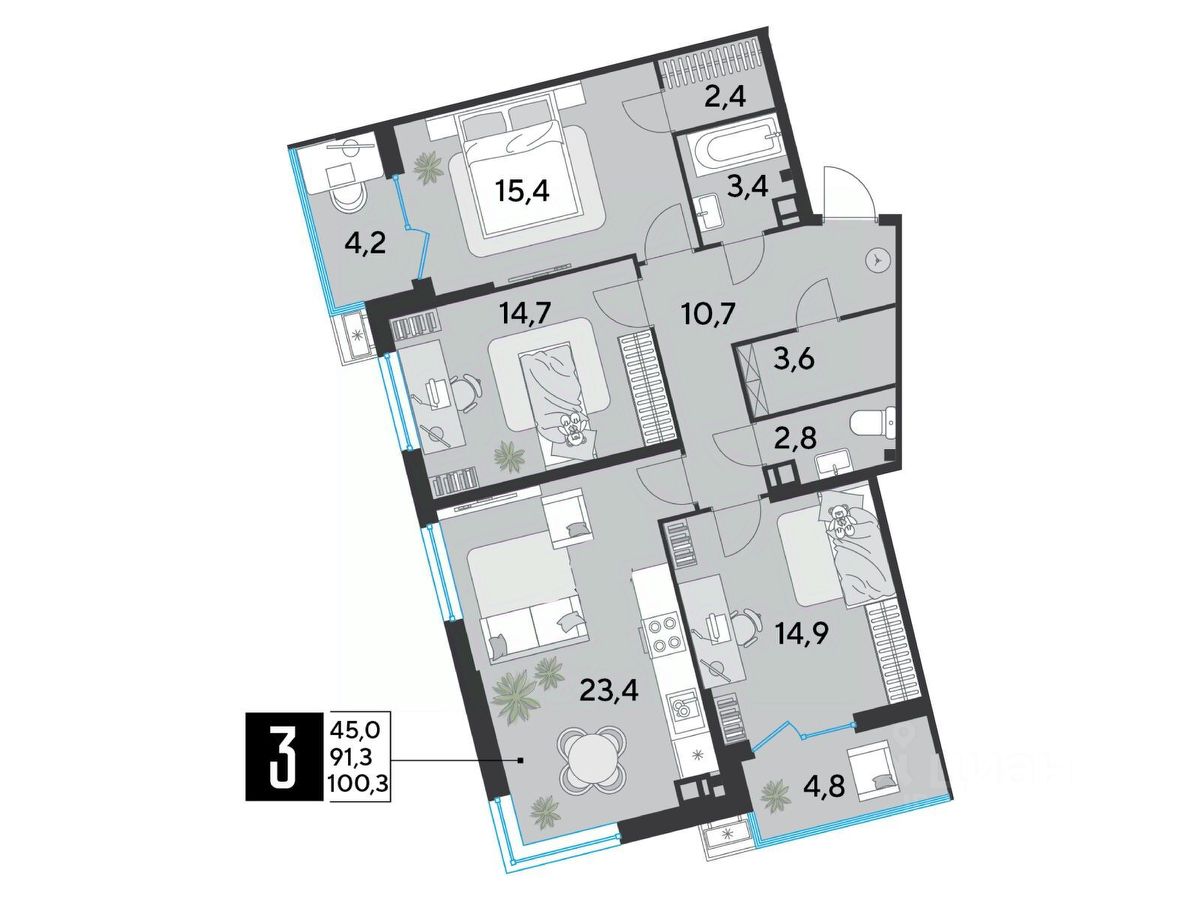 Срок сдачи: 2 кв. 2026, общей площадью 100.3 кв.м., на 8 этаже.