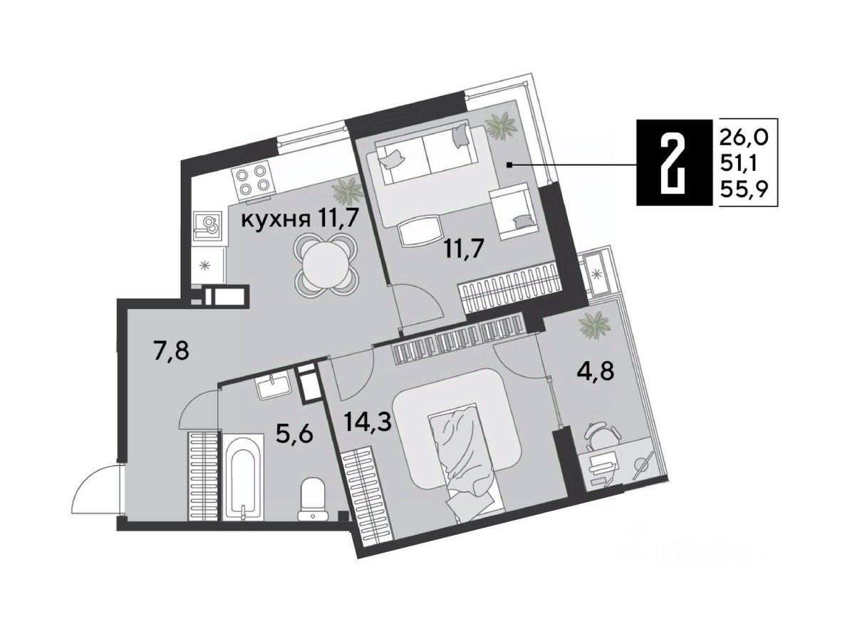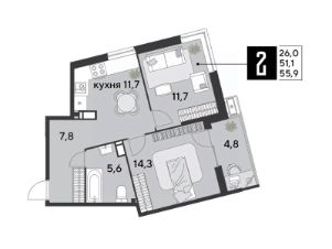 Срок сдачи: 2 кв. 2026, общей площадью 55.9 кв.м., на 14 этаже.
