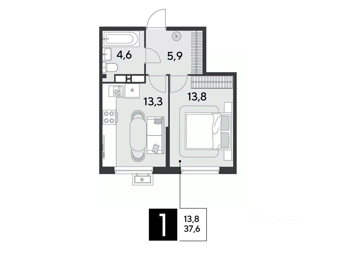 Срок сдачи: 2 кв. 2026, общей площадью 37.6 кв.м., на 18 этаже.