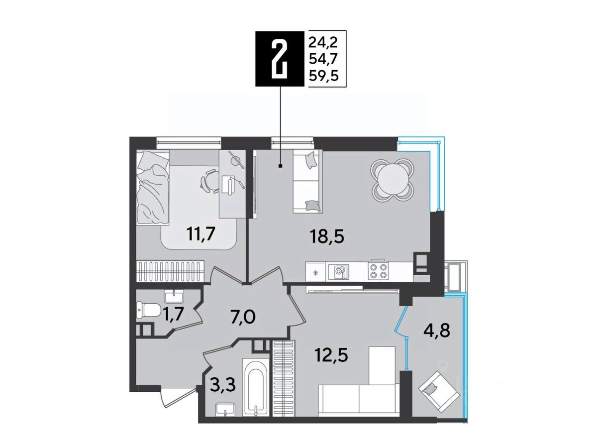 Срок сдачи: 2 кв. 2026, общей площадью 59.5 кв.м., на 7 этаже.