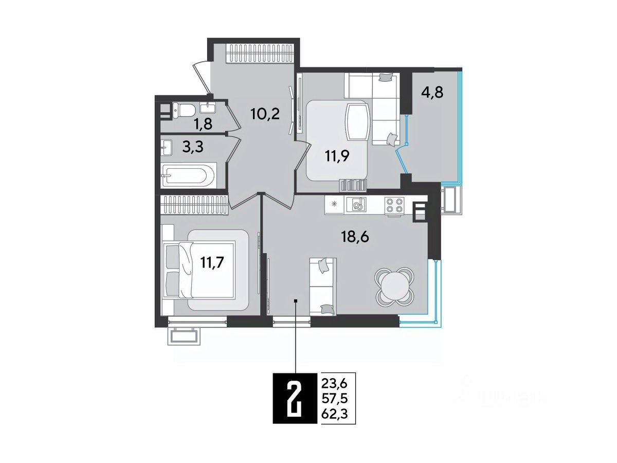 Срок сдачи: 1 кв. 2026, общей площадью 62.3 кв.м., на 5 этаже.