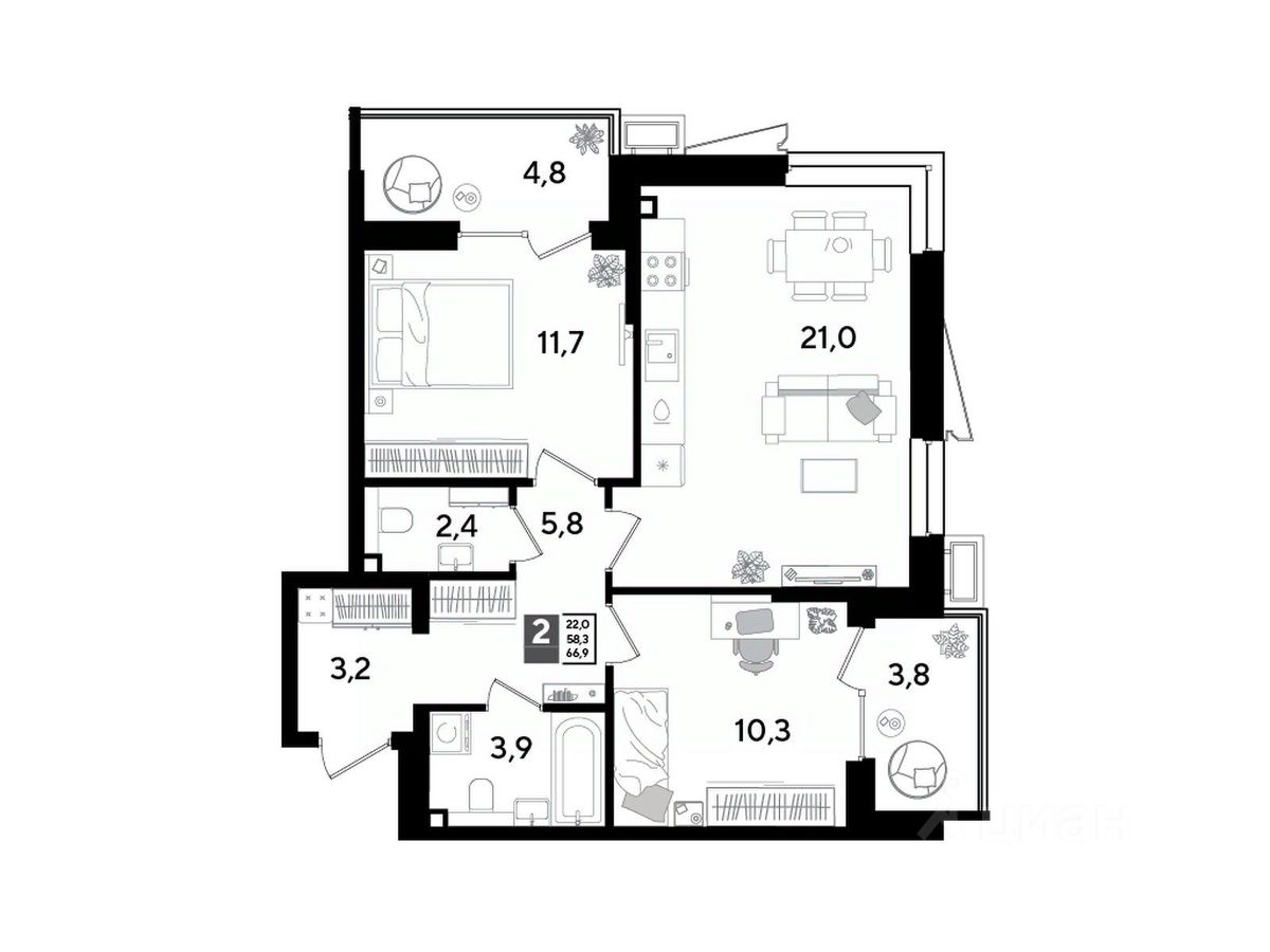 Срок сдачи: 1 кв. 2026, общей площадью 66.9 кв.м., на 2 этаже.