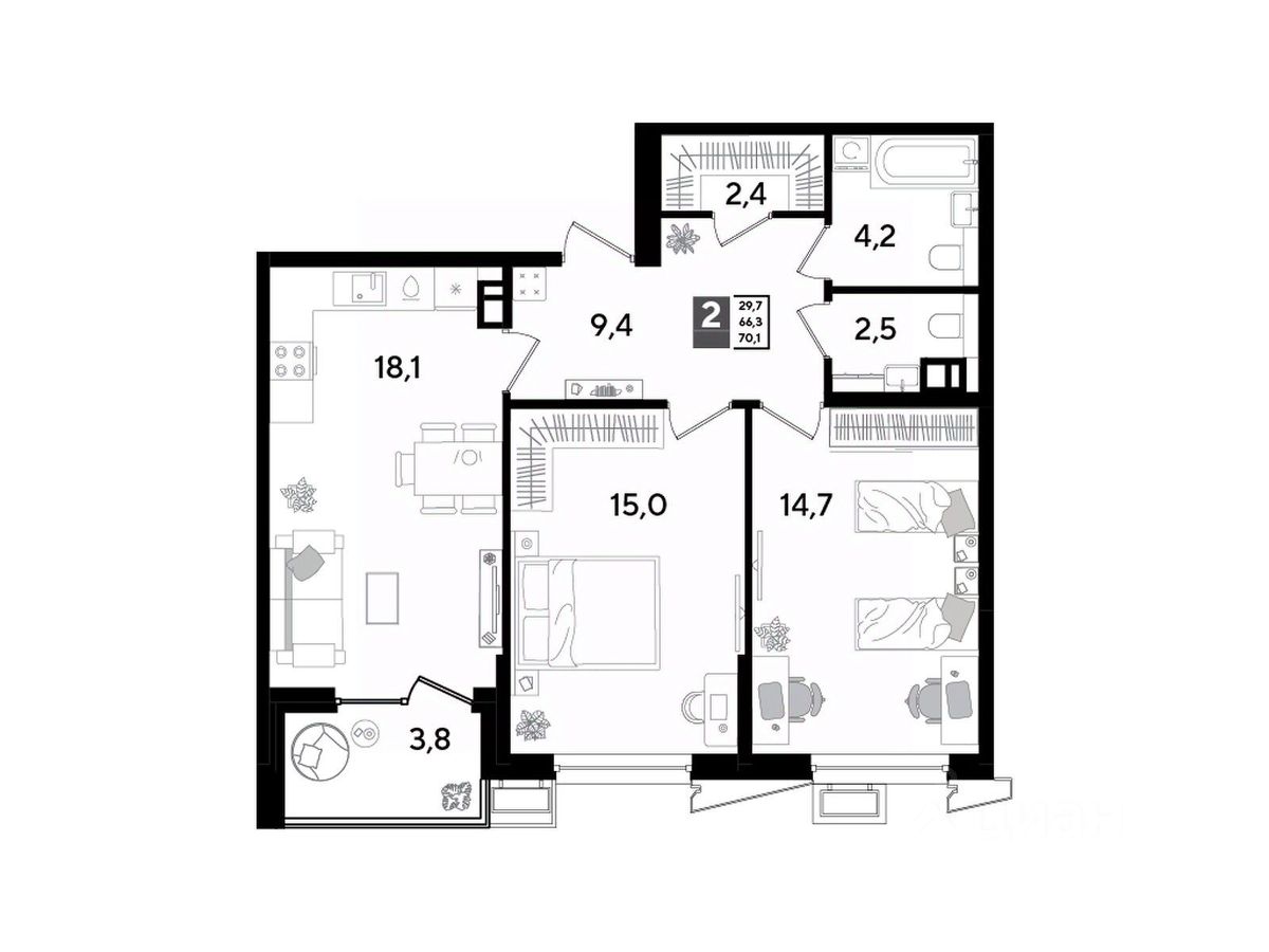 Срок сдачи: 1 кв. 2026, общей площадью 70.1 кв.м., на 3 этаже.