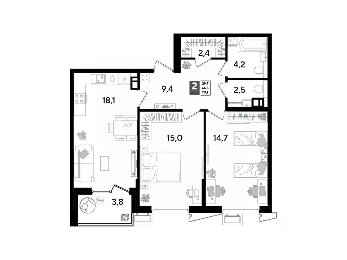 Срок сдачи: 1 кв. 2026, общей площадью 70.1 кв.м., на 9 этаже.