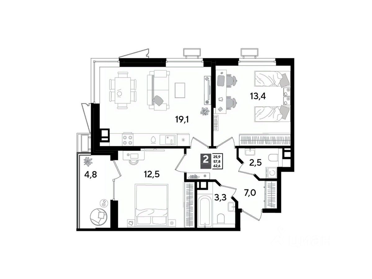 Срок сдачи: 1 кв. 2026, общей площадью 62.6 кв.м., на 4 этаже.