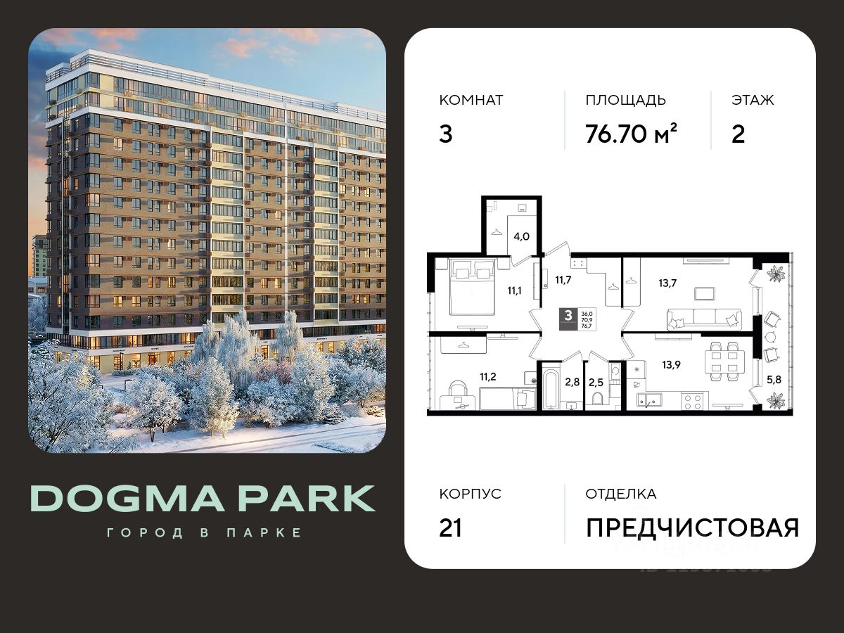 В продаже 3-комнатная квартира от застройщика! Мкр. "ДОГМА ПАРК" г. Краснодар, Литер 21 Срок сдачи: 2 кв. 2027, общей площадью 76.70 кв.м., на 2 этаже.