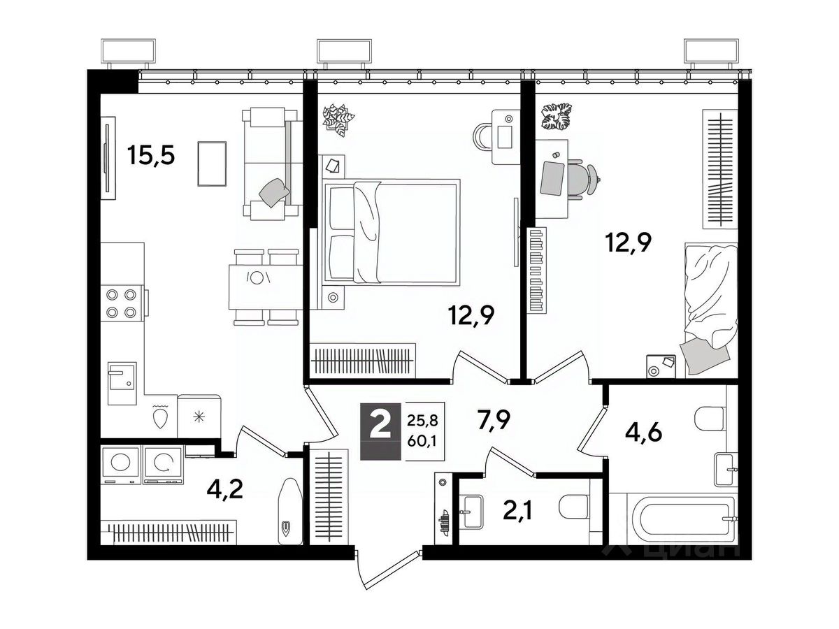 В продаже 2-комнатная квартира от застройщика! Мкр. "DOGMA PARK" г. Краснодар, Литер 31 Срок сдачи: 3 кв. 2027, общей площадью 60.1 кв.м., на 2 этаже.