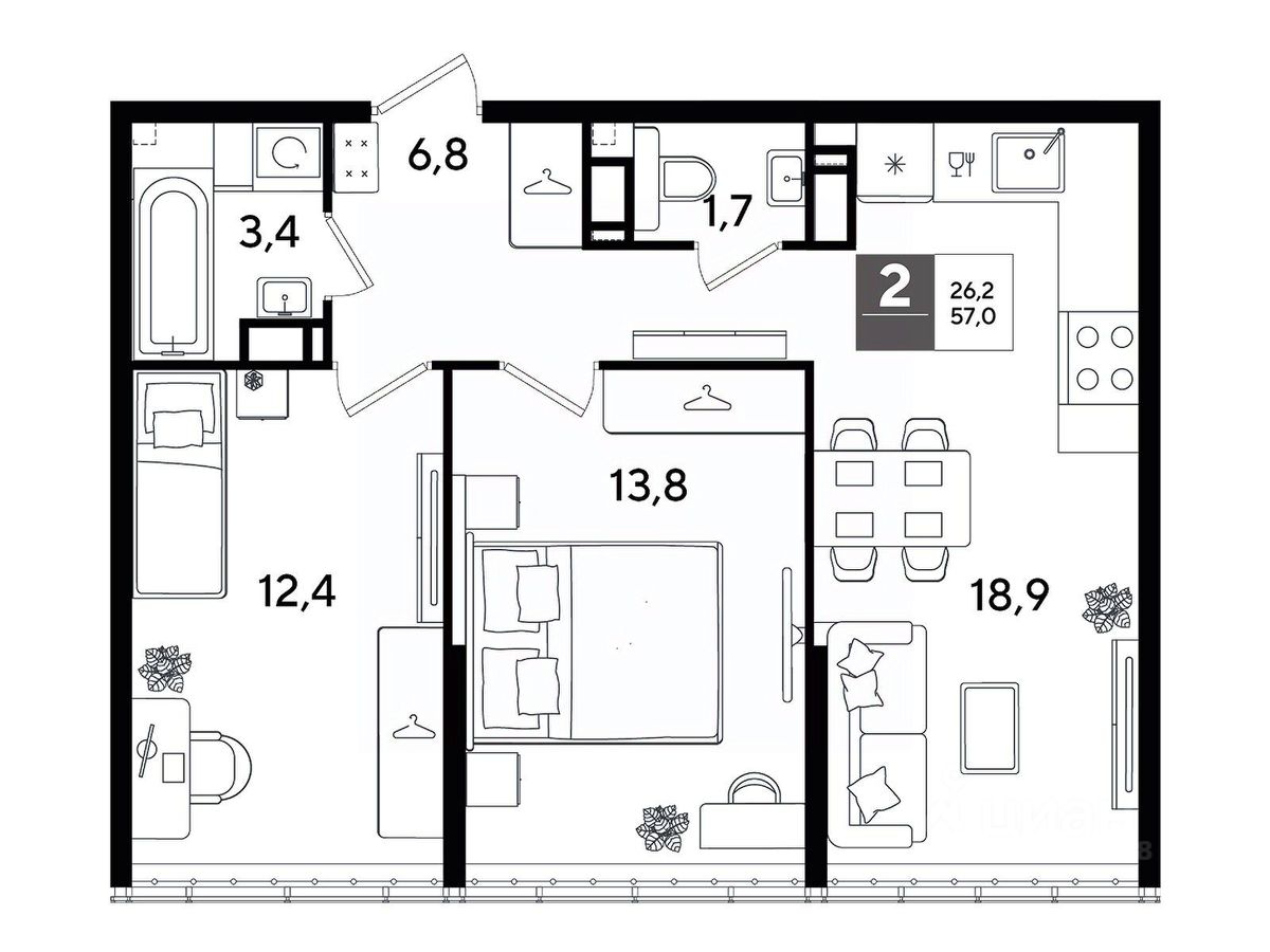 В продаже 2-комнатная квартира от застройщика! Мкр. "DOGMA PARK" г. Краснодар, Литер 24 Срок сдачи: 4 кв. 2027, общей площадью 57 кв.м., на 15 этаже.