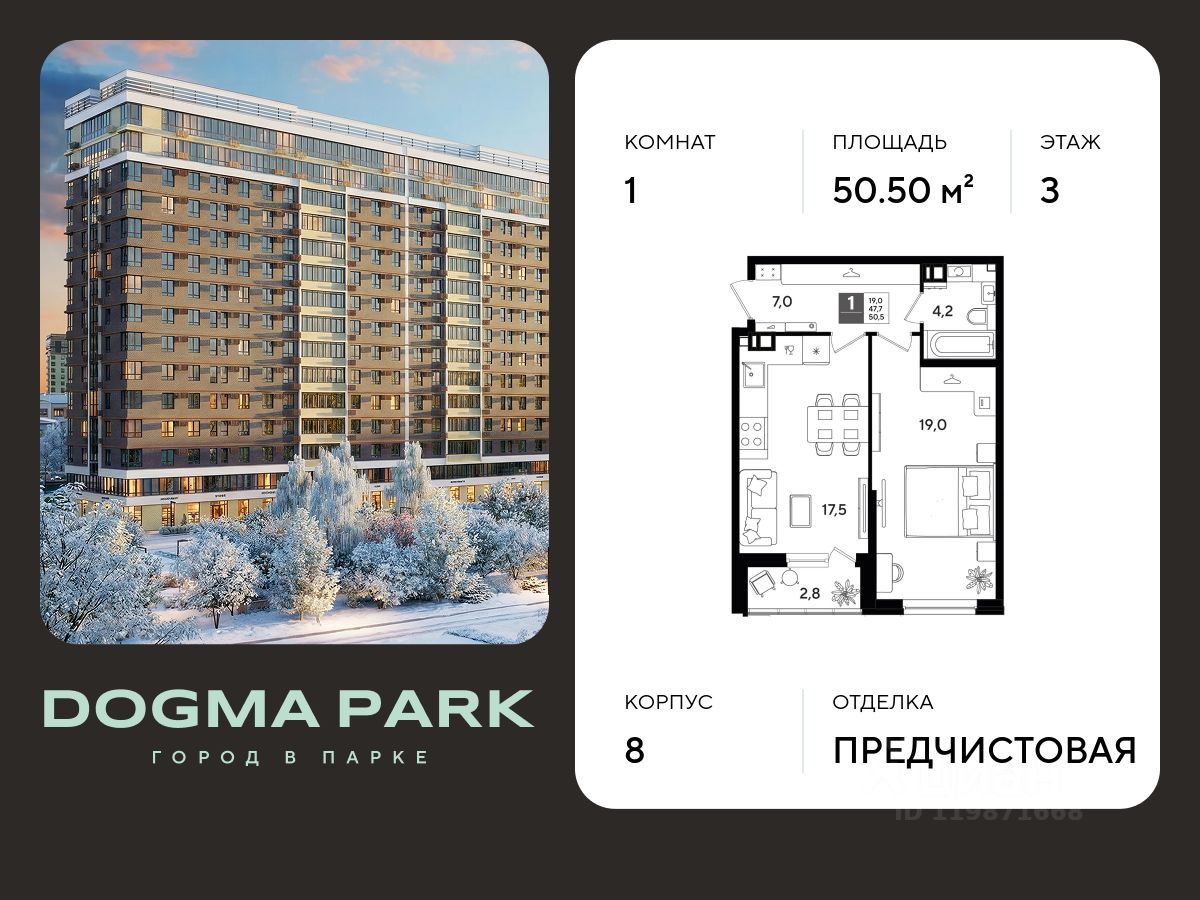 В продаже 1-комнатная квартира от застройщика! Мкр. "ДОГМА ПАРК" г. Краснодар, Литер 8 Срок сдачи: 2 кв. 2027, общей площадью 50.50 кв.м., на 3 этаже.