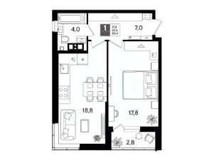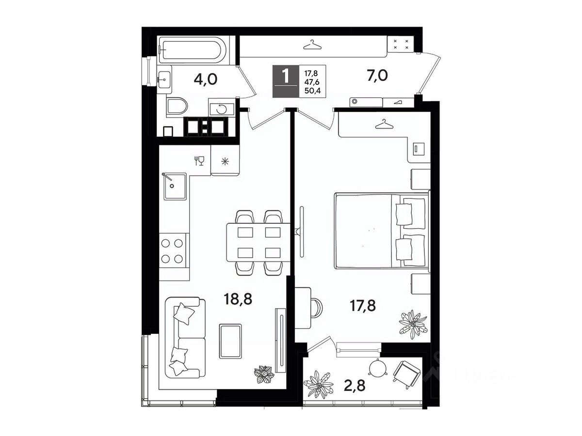 В продаже 1-комнатная квартира от застройщика! Мкр. "DOGMA PARK" г. Краснодар, Литер 8 Срок сдачи: 4 кв. 2026, общей площадью 50.4 кв.м., на 4 этаже.
